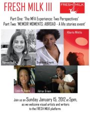 Join us on January 15th 2012 at 5pm, at the Milking Parlour Studio, Walkers Dairy, St. George in welcoming visual artists and writers to the FRESH MILK platform. (For directions visit http://www.annaleedavis.com/contact/index.html) The Programme Part One of the programme: , ‘The MFA Experience: Two Perspectives’ Alberta Whittle and Harriet Rollitt, (two Barbadian Visual Artists who have just graduated with MFA degrees from the UK) kick off the event by sharing their Graduate school experiences and discuss how the Masters programme has impacted on their practice. Part Two of the programme: ‘MEMOIR MOMENTS: ABROAD – A life stories event’. In this life stories event emcee’d by Dorothea Smartt – Linda Deane, Adrian Green, Harriet Rollitt, Alberta Whittle and Dorothea Smartt – with only twenty images in ten minutes, will convey their memoir moments related to our chosen theme: “Abroad”. Each interpretation will be unique to each presenter. They may confound or confirm your expectations, with their personal take on the theme. This ‘pecha kucha’ inspired format, was founded by London’s Woolfson & Tay Bookshop for their pioneering ‘Life Stories Cafe’. Dorothea Smartt, the events’ Emcee and co-curator, together with Fresh Milk, will introduce the format to a new audience here in Barbados. Come watch & listen, discover how each uses the constraints and possibilities of ‘twenty images: ten minutes’. |