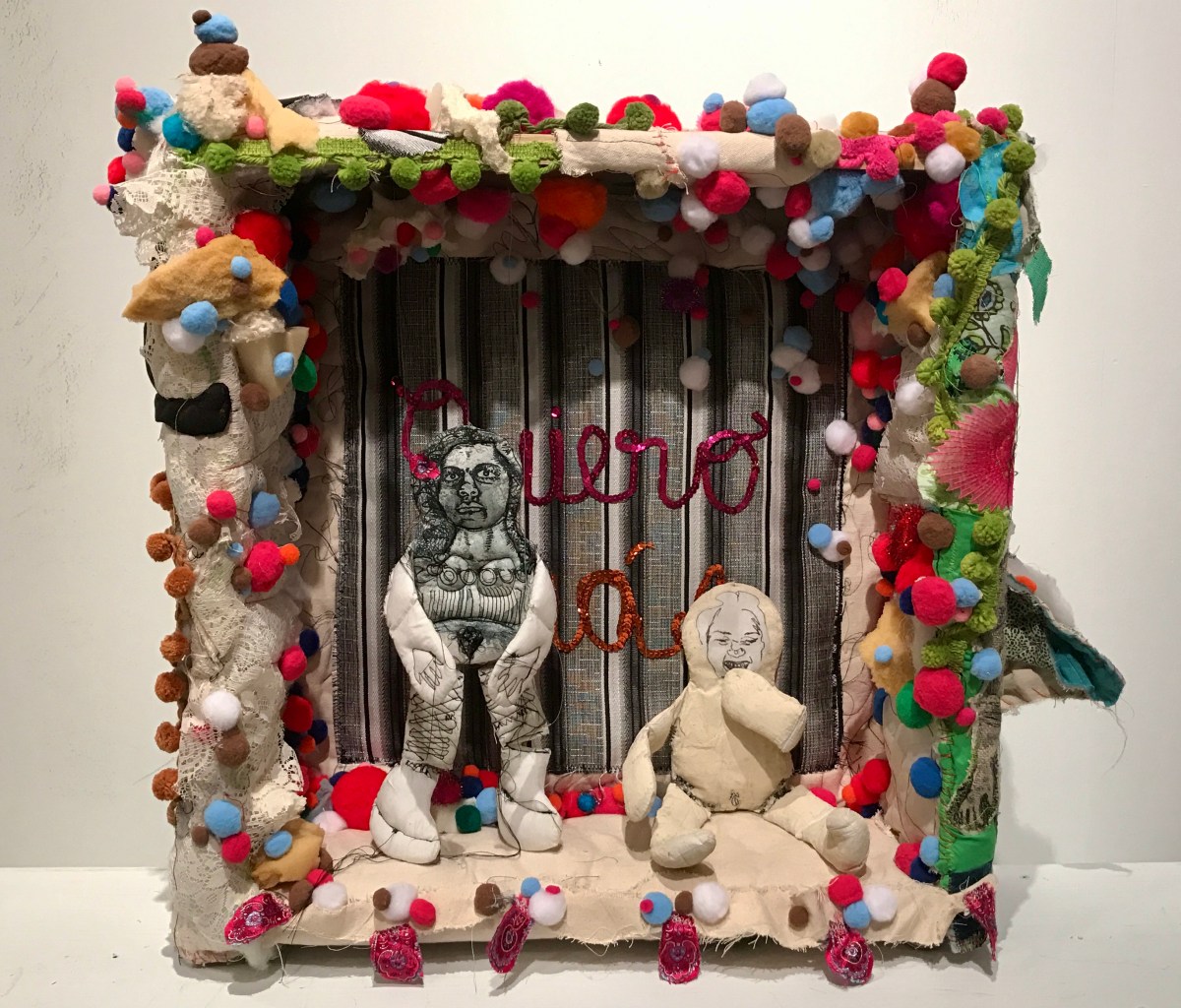 títeres impresos en intaglio y xerografía, caja de madera forrada de textiles