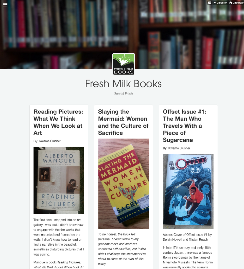 In an age where most of our ideas about the world are shaped by the media we consume, our ability to read images and decode the ideas they represent is vital. Though the dominant collective of our mediated online and offline communications is the marketplace, and ideas transmitted through them, FMBs similarly demonstrates the creative potential allowed by virtual geographies. As an expanded critical space, Fresh Milk Books is reimagining who and what we consider art/spaces/identity to be.