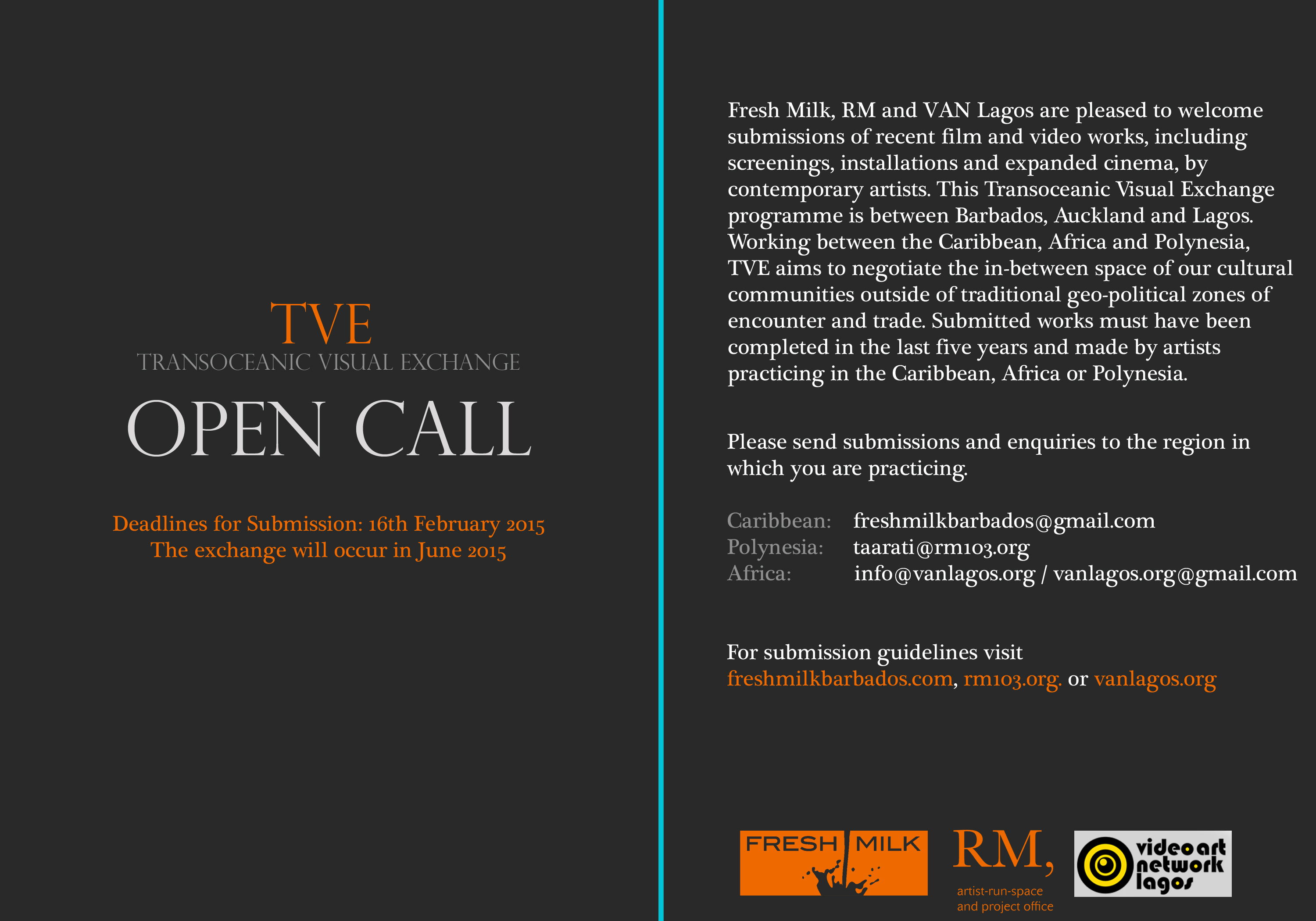The IAI project has since led to a co-curated artistic exchange currently in development between three of the spaces – Fresh Milk, RM and Video Network Lagos. Transoceanic Visual Exchange or TVE will select video shorts and feature films for an online exhibition of works from the Caribbean, Polynesia and Africa. As a web-based project, it stretches beyond fixed geo-political frameworks, allowing non-traditional relationships to mature, in this case between Barbados, New Zealand and Nigeria.